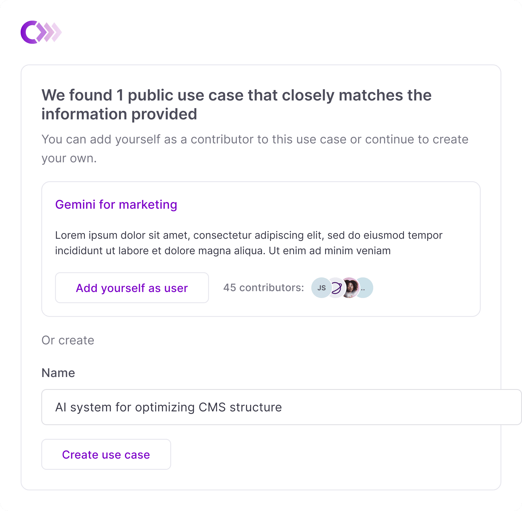 Discovery builds awareness, but prevention happens at registration. The AI-assisted flow evaluates user intent and surfaces existing systems with overlapping purpose, prompting an explicit choice: join an existing system or explain why a new use case is needed. This turns duplication from an accidental outcome into a deliberate decision, preventing fragmentation while still allowing warranted exceptions.