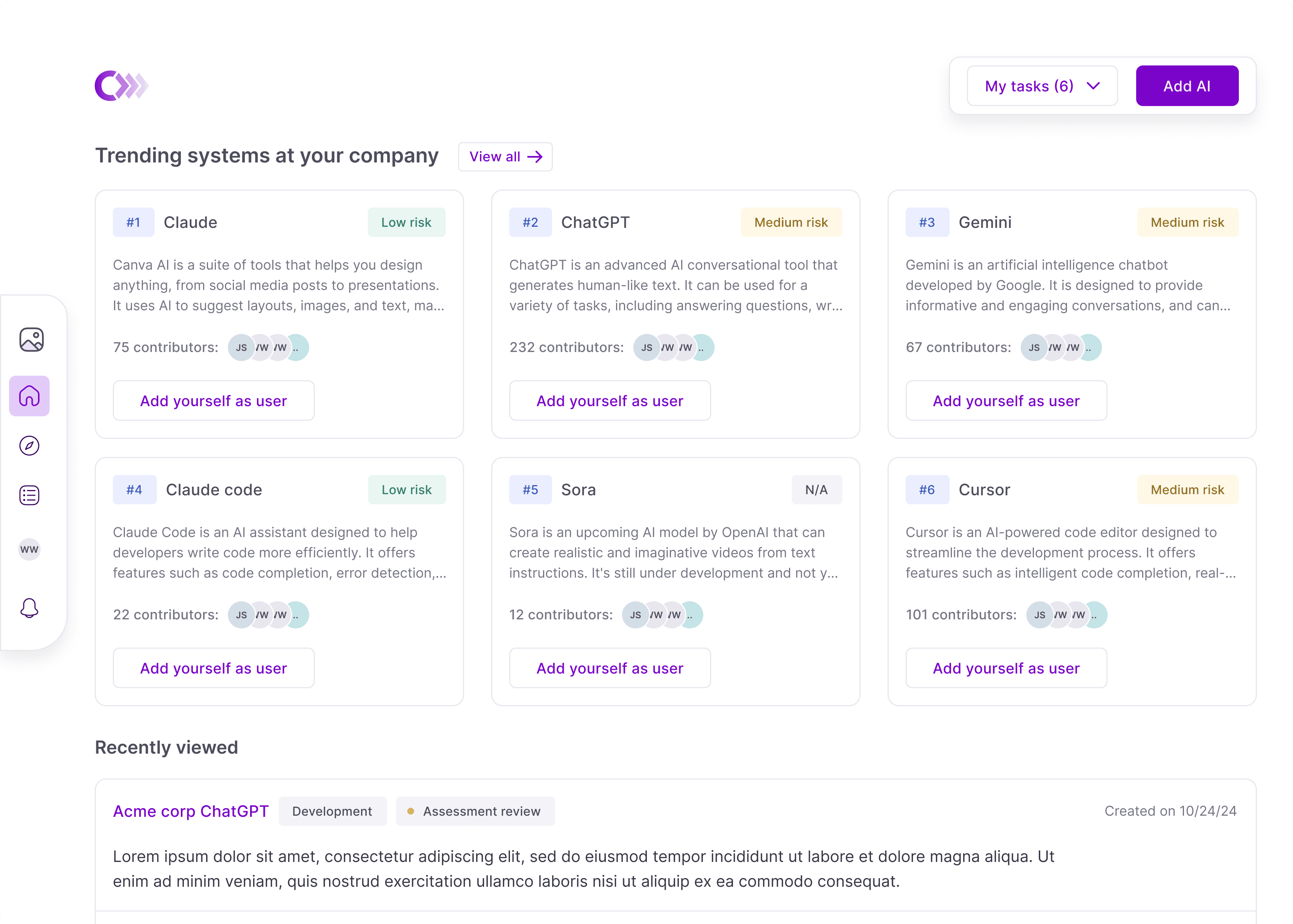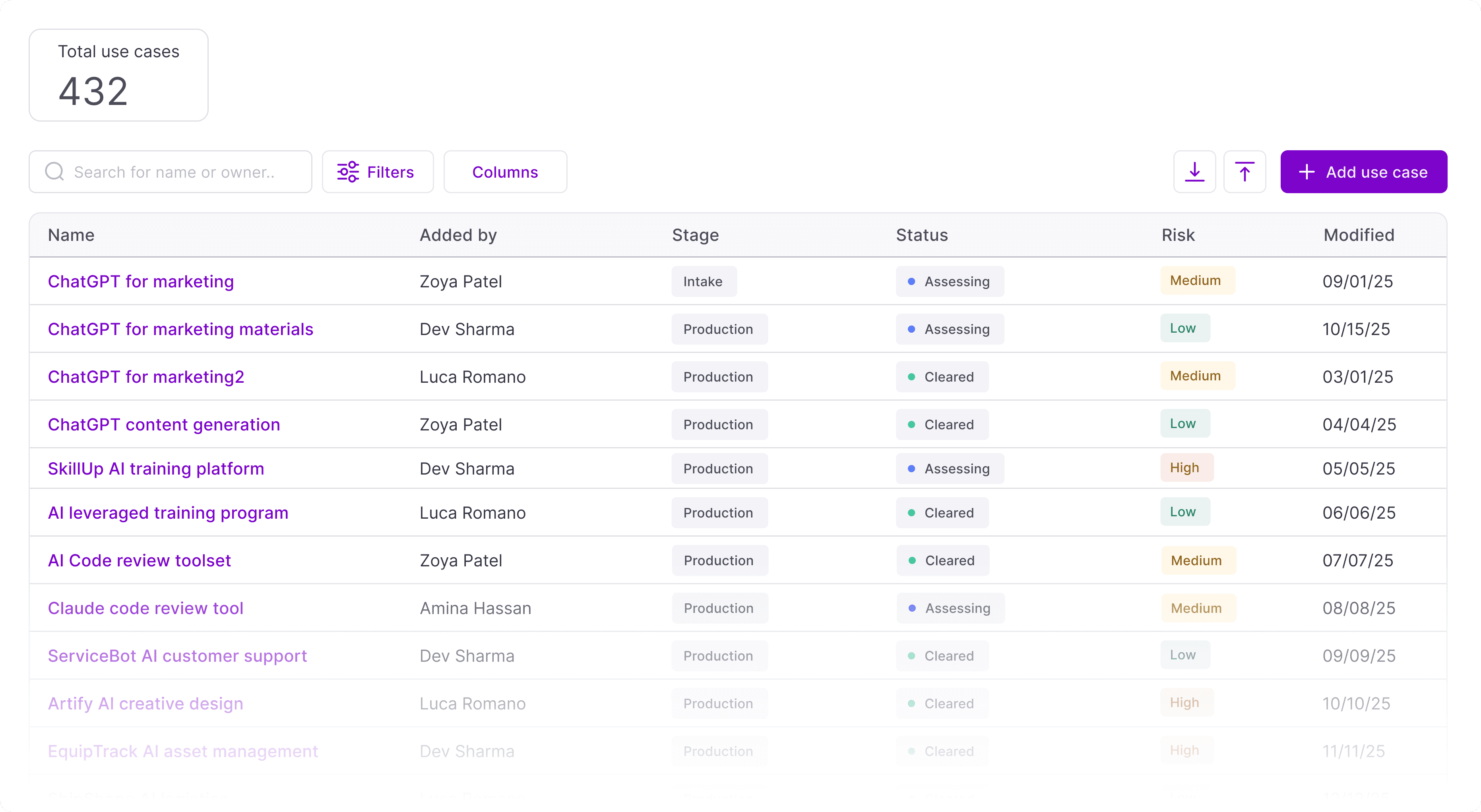 As AI adoption scaled, teams registered the same tools repeatedly under slightly different use cases. Each instance required separate review, ownership, and maintenance—fragmenting context and multiplying governance effort without improving oversight. What looked like growth was actually duplication.
